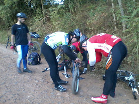Mais a frete, optamos por voltar pela Vila Rosso, e lá adivinhe o que aconteceu? A Vanessa furou o pneu traseiro, e desta vez o que furou a câmara foi um arame do próprio pneu que se rompeu, sinal de pneu velho, ressecado, mesmo tendo pouco uso. Algumas piadas sobre o acontecimento como: “O maníaco da pinça atacou novamente.”, ou “Só o pelotão ‘feminino’ furou pneu.”