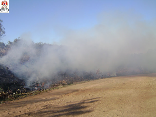 Logo após a Curva dos Pinheiros, em frente a propriedade do "cachorro dos mortais", colocaram fogo em restos de eucaliptos, fazendo muita fumaça, em uma legítima falta do que fazer, até porque tinha galhos e troncos de considerável espessura, que dariam uma boa lenha.