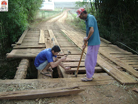 Mas isso não seria obrigação do poder público municipal? Ha, ha, de uma administração que deixou a vitrine, a área central da cidade um queijo suíço, o quê esperar do interior!? E quem nos dera que fosse somente esta ponte no interior neste estado.