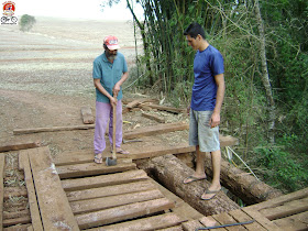 O concerto que eles estavam realizando seria apenas nas tábuas onde passam as rodas dos veículos, o buraco na lateral iria continuar, ou seja, veículos com bitola maior que o normal não poderão cruzar como colheitadeiras e, principalmente agora, as plantadeiras.